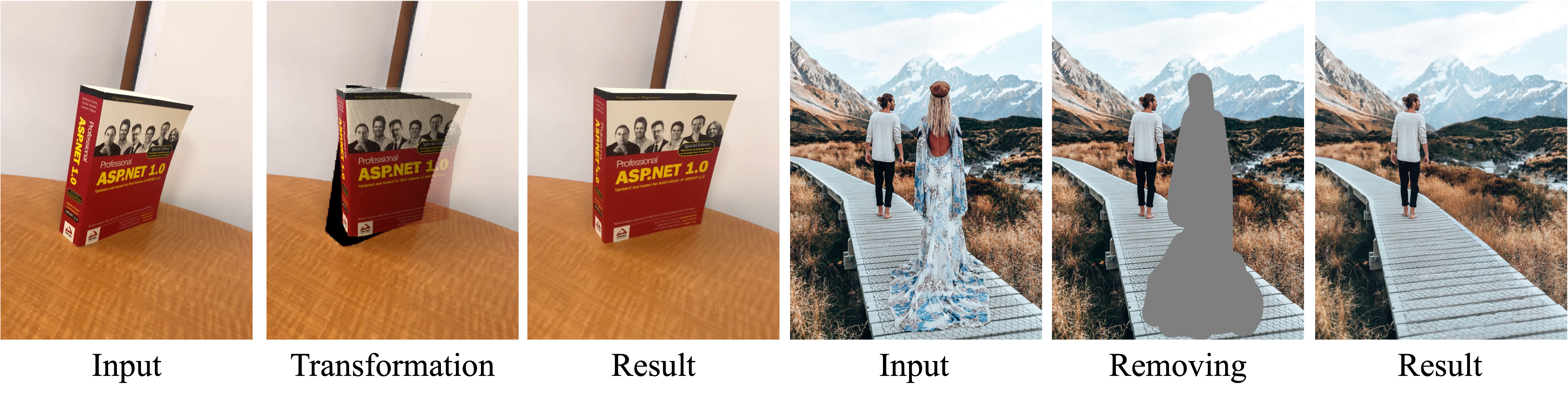 The left example shows object 3D editing, while the right example shows object removal, highlighting the versatility of our model in different spatial editing tasks.
