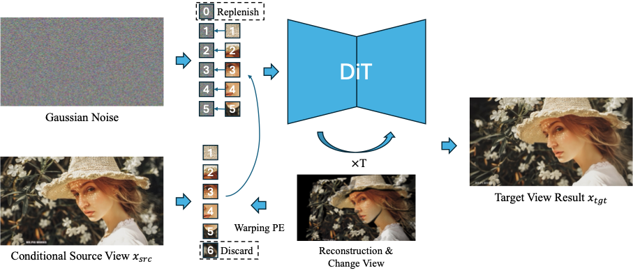 We apply 2D positional encodings (PEs) derived from 3D reconstruction and view transformation directly to the source-view image tokens. Using these modified tokens as image conditions in DiT enables direct generation of a relatively accurate novel-view image.
