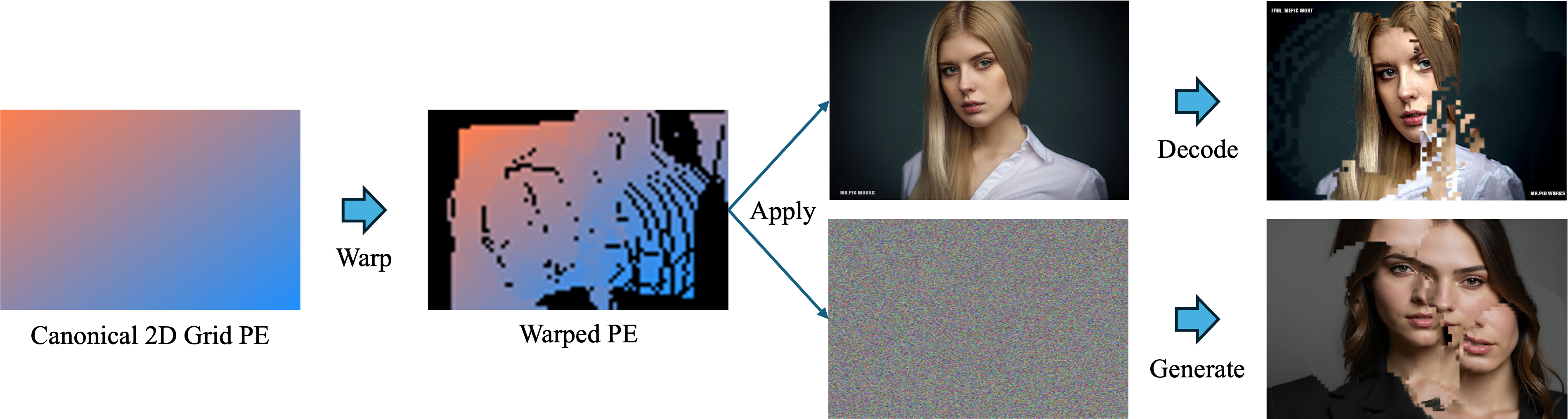 When positional encodings (PEs) of image tokens or noise tokens are perturbed, the decoded or generated outputs still produce semantically meaningful images. The resulting structures follow the warping imposed by the PE modification, while boundaries between patches remain visually distinct.